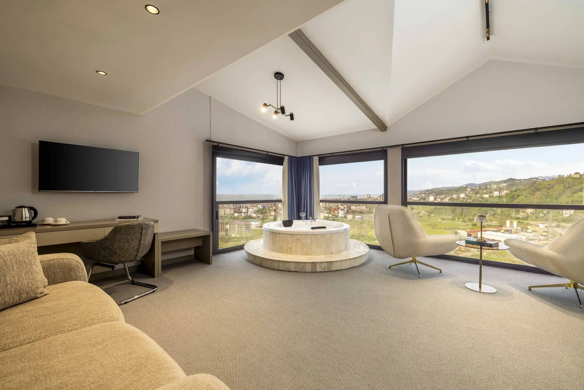 Ayrı oturma alanı ve özel olanaklara sahip şık süit oda.
